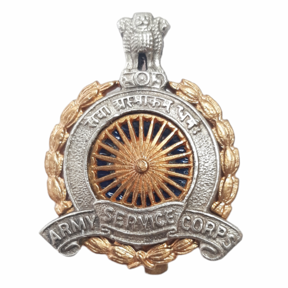 A origem do IASC remonta a 1760, quando foi fundado durante o período da Companhia das Índias Orientais (EIC). O IASC era um componente administrativo dos exércitos da EIC nas presidências de Bombaim, Madras e Bengala e em 1878, os Comissariados separados foram reunidos em uma única entidade o que levou a uma mudança em 1901, quando foi renomeado como "Supply and Transport Corps” (Corpo de Abastecimento e Transporte). Durante a Primeira Guerra Mundial, o corpo tornou-se um componente permanente do Exército Indiano Britânico e foi renomeado como “Indian Army Service Corps” (Corpo de Serviço do Exército Indiano) em 1923. Em 1935, o corpo recebeu o prefixo "Real" em sua nomenclatura e ficou conhecido como “Royal Indian Army Service Corps” (RIASC) (Corpo de Serviço do Exército Real Indiano). Em 08 de dezembro de 1950, depois que a Índia se tornou uma república, o corpo abandonou o uso do prefixo "Real" e foi mais uma vez renomeado como "Corpo de Serviço do Exército Indiano" (IASC). Desde aquele dia, o corpo celebrou o “Raising Day” em 08 de dezembro. O IASC desempenha um papel crucial na aquisição, fornecimento e distribuição de suprimentos essenciais, combustíveis, produtos químicos de higiene e itens de conforto hospitalar para o Exército, a Marinha, a Força Aérea e, quando necessário, para as forças paramilitares. Além disso, é responsável pela operação de transporte mecânico, exceto para veículos de transporte e combate de primeira linha, e pelo fornecimento e operação de transporte de animais de primeira e segunda linha. Durante o domínio britânico, o lema do IASC era "HoniSoit Qui Mal Y Pense", que se traduz como "mal para quem pensa mal". Após a independência, o lema foi alterado para "Seva Asmakam Dharma", que significa "Serviço é o nosso credo". O Brasão de Armas da Índia é uma adaptação do Sarnath Lion Capital de Ashoka. O Imperador Ashoka ergueu o grande capital em Sarnath para marcar o local onde Gautama Buda ensinou o Dharma pela primeira vez e onde a comunidade budista foi fundada. O emblema apresenta quatro leões, de costas uns para os outros, em pé sobre um ábaco, com um friso que carrega esculturas em relevo de um elefante, um cavalo galopante, um touro e um leão, separados por sinos em forma de lótus. Esculpido em um único bloco de arenito polido, o capital é coroado pela Roda da Justiça (Dharmachakra). Este emblema foi adotado como o Emblema Nacional da Índia em 26 de janeiro de 1950, o dia em que a Índia se tornou uma república.